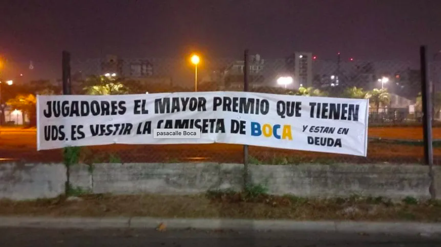 Pasadas las dos y media de la madrugada, se vio colgada la bandera en una reja en las adyacencias del estadio. “Jugadores, el mayor premio que tienen ustedes es vestir la camiseta de Boca. Y están en deuda”, se lee en letras grandes.