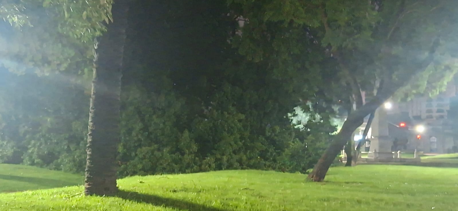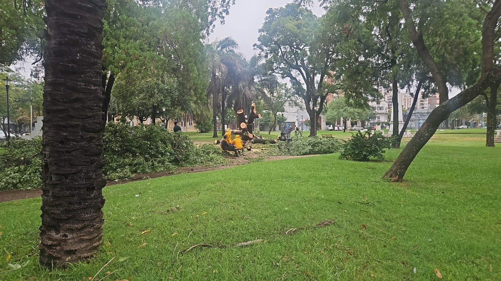Según se pudo constatar, la gran copa del árbol se desplomó sobre los bancos ubicados en el paso diagonal de la plaza, en las inmediaciones de la esquina de Hipólito Yrigoyen y San Luis, lo que provocó la obstrucción total del paso peatonal.