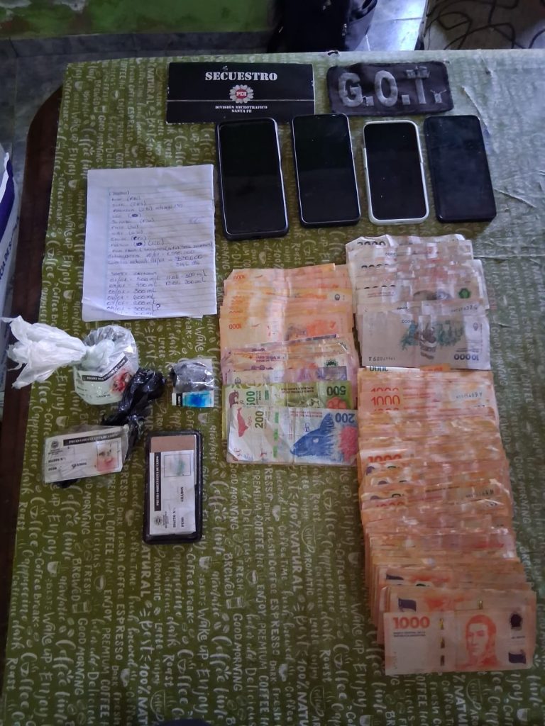 Durante los procedimientos, el personal policial secuestró 14 gramos de cocaína fraccionada para la venta, 29 gramos de marihuana acondicionados en envoltorios de nylon, dos balanzas digitales con vestigios de cocaína, dinero en efectivo, cinco armas de fuego —entre ellas dos escopetas, tres revólveres calibre .22 largo (uno de ellos desarmado) y una pistola marca Bersa—, un total de 67 municiones de distintos calibres (.380, 9 mm, .32 y 12/70), y 11 teléfonos celulares.