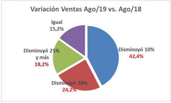 Como observamos, sólo un 15,2% declaró haber sostenido niveles iguales a Agosto 2019, mientras que el resto, es decir 84,8% manifestó haber vendido menos, con distintas incidencias porcentuales en las caídas. Pero, porqué sostenemos que fue un mes dividido en dos partes? El mes de Agosto había comenzado con interesantes y prometedores niveles de actividad, donde se apreciaba el impulso generado por la utilización de Ahora 12 (con sus variantes de 3, 6 o hasta 18 cuotas) y estaba justificando buenas expectativas entre los comerciantes.