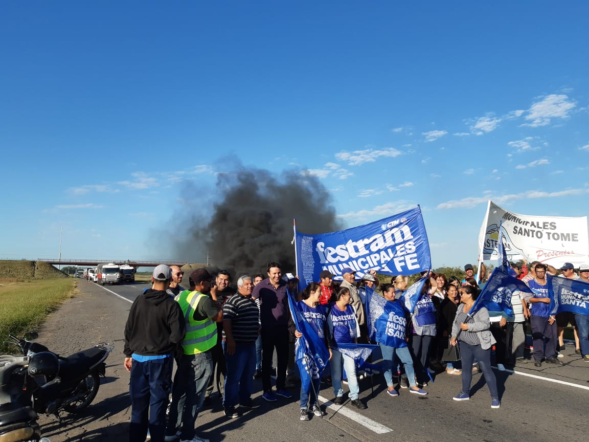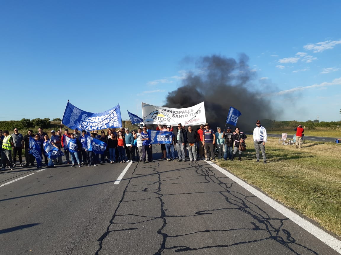 Trabajadores municipales de la ciudad de Coronda realizan un corte en la Autopista Santa Fe – Rosario, a la altura del kilómetro 100, en reclamo del pago de haberes en tiempo y forma.