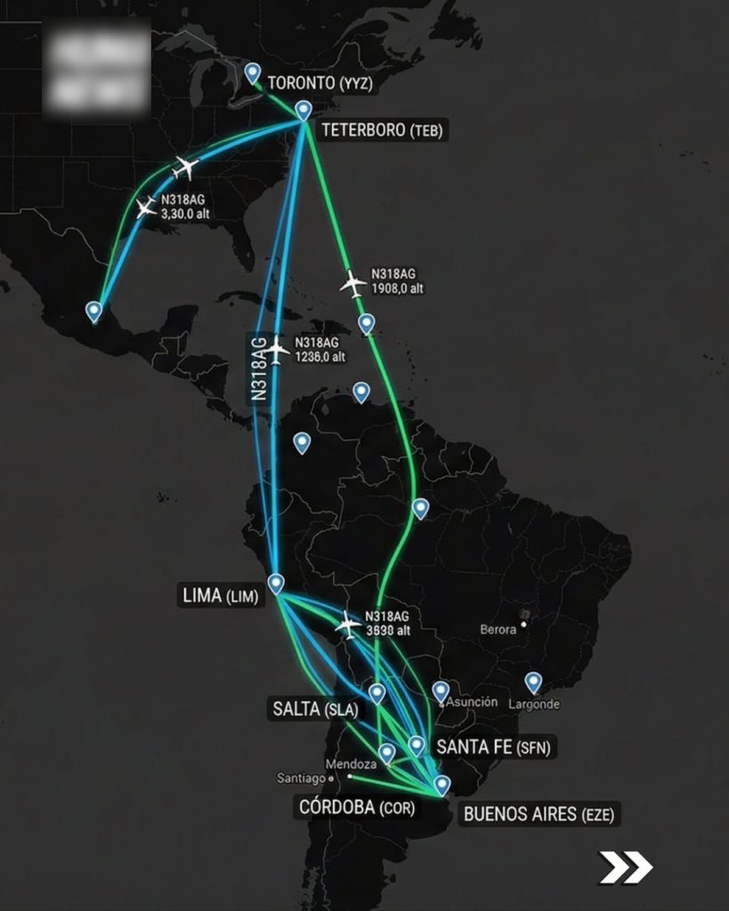 En los últimos días, el jet había generado atención en la región por sus reiterados movimientos en el espacio aéreo santafesino. Registros de seguimiento muestran que en la última semana realizó trayectos entre ciudades como Lima, Córdoba, Santa Fe, Ezeiza, Salta, Toronto y Teterboro, además de varios vuelos cortos entre Santa Fe y Buenos Aires.