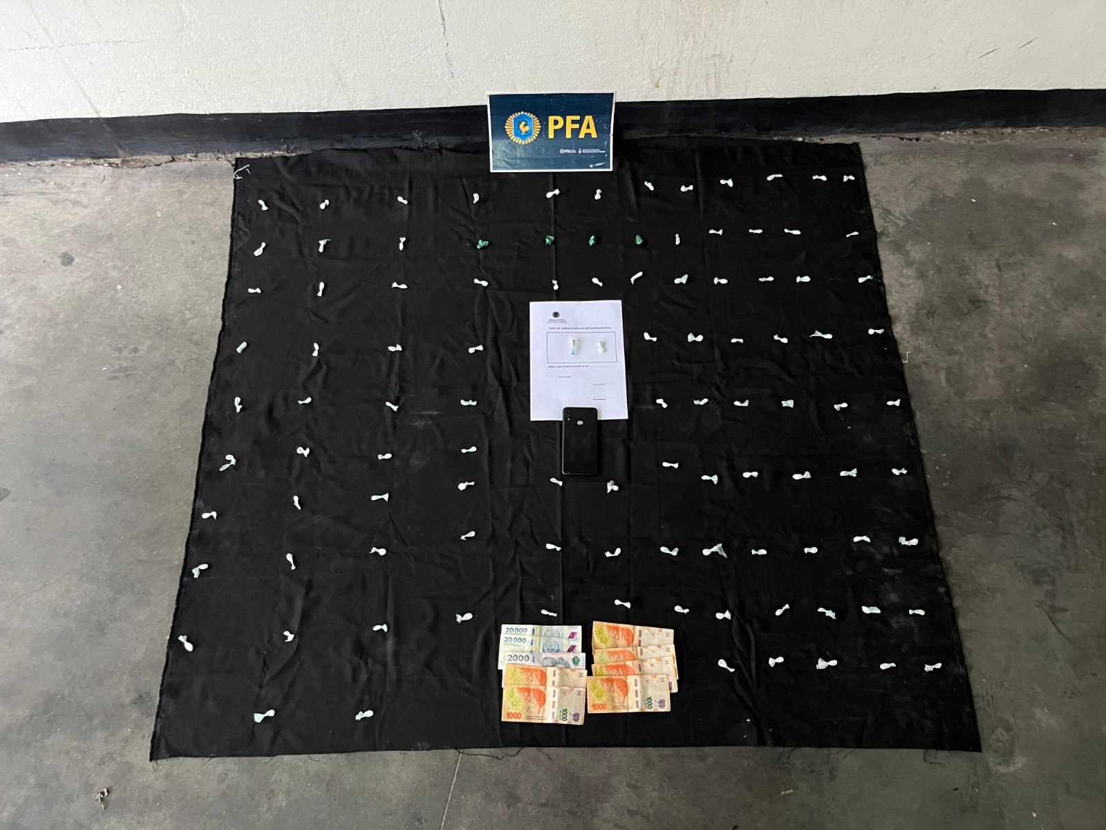 Tras identificarlos y con la presencia de testigos, los uniformados requisaron la zona y hallaron, oculto en un hueco dentro de un poste de alumbrado público, una bolsa de nylon con 103 envoltorios que contenían clorhidrato de cocaína. Además, secuestraron 48 mil pesos en efectivo y un teléfono celular que sería propiedad de uno de los implicados.