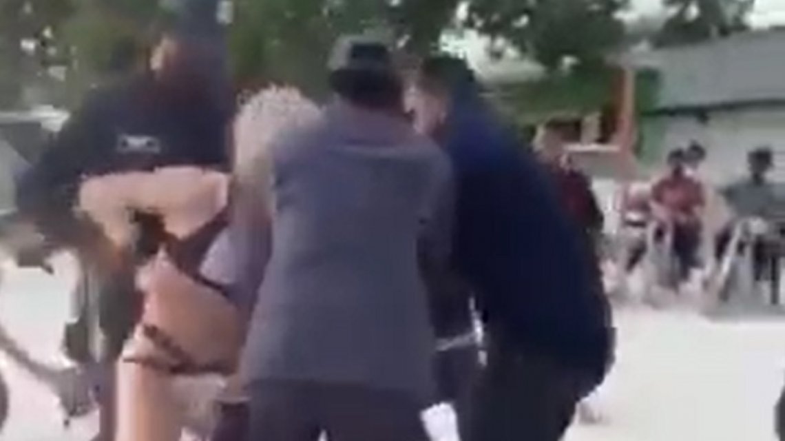 También se ve a un hombre intentar cubrirla con una toalla. En otro video previo, la mujer le saca los anteojos de sol a uno de los policías.