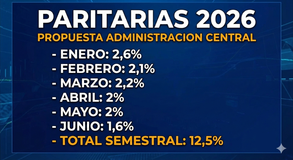 El Gobierno provincial oficializó este miércoles la propuesta salarial para los trabajadores de la administración central en el marco de la negociación paritaria. El ofrecimiento prevé un incremento del 12,5% para el primer semestre de 2026, distribuido en tramos mensuales: 2,6% para enero, 2,1% para febrero, 2,2% para marzo, 2% para abril y mayo, respectivamente, y 1,6% para junio.