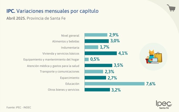 En Santa Fe, el promedio del cuarto mes del año fue 0,1% superior al promedio nacional; según datos del Instituto Provincial de Estadísticas y Censo (IPEC) la inflación de abril en la Provincia trepó al 2,9%. La variación interanual se ubica en 48,2%, acumula en 2025 un 12,7%.
