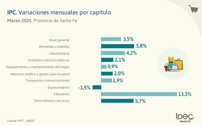 En Santa Fe, el promedio del tercer mes del año fue 0,2% inferior al promedio nacional; según datos del Instituto Provincial de Estadísticas y Censo (IPEC) la inflación de marzo en la Provincia trepó al 3,5%. La variación interanual se ubica en 54,3%, acumula en 2025 un 9,5%.