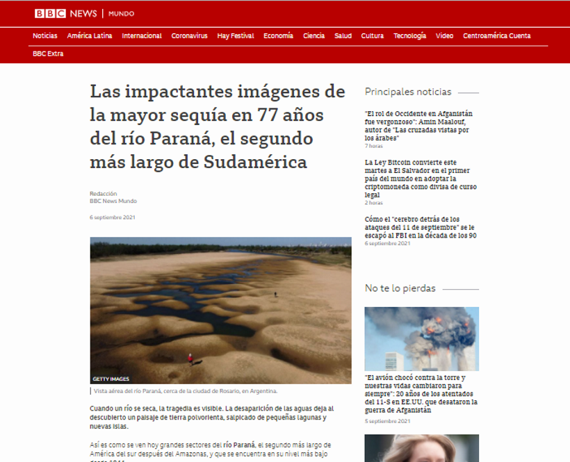 En tanto BBC Mundo realizó un trabajo fotográfico que incluye tomas aéreas en las islas frente a Rosario. “Cuando un río se seca, la tragedia es visible. La desaparición de las aguas deja al descubierto un paisaje de tierra polvorienta, salpicado de pequeñas lagunas y nuevas islas. Así es como se ven hoy grandes sectores del río Paraná, el segundo más largo de América del sur después del Amazonas, y que se encuentra en su nivel más bajo desde 1944”, señala el artículo.