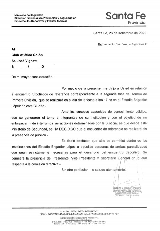 En este contexto, y por decisión del Ministerio de Seguridad de la Provincia, el encuentro que se realizará en el estadio Brigadier López, por la fecha 21 del Torneo de la Liga Profesional, se jugará sin la presencia de público en las tribunas.