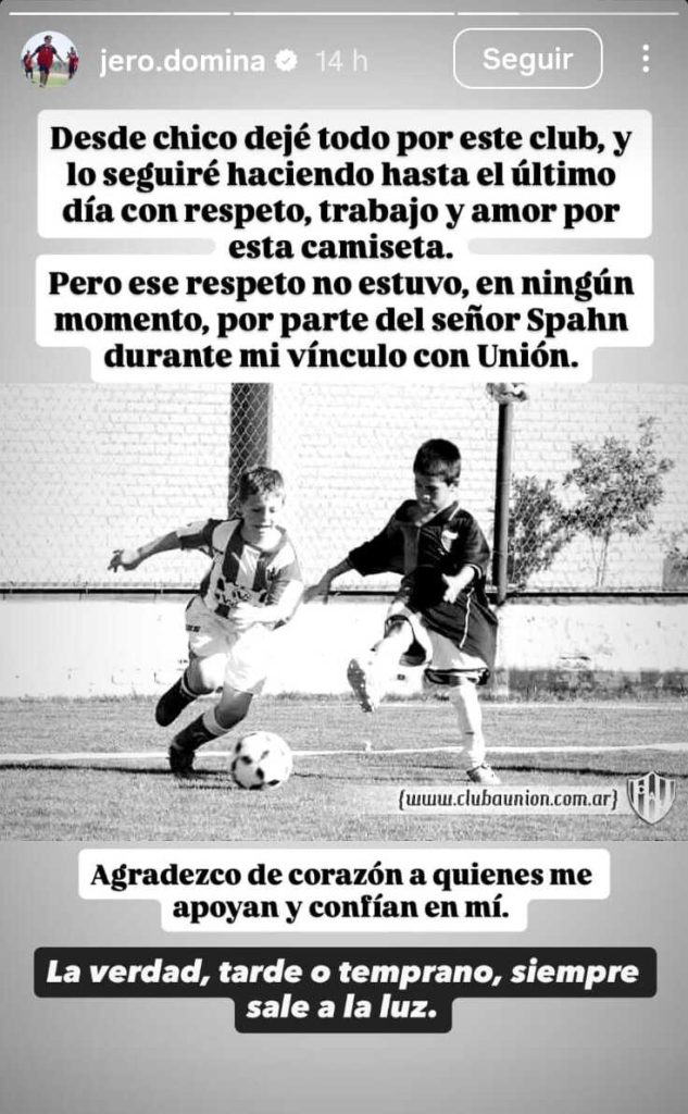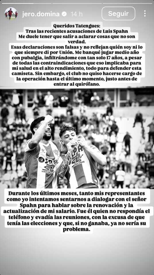 En medio de la tensión con la dirigencia de Unión, el delantero Jerónimo Dómina utilizó sus redes sociales para dar su versión y responder públicamente a las declaraciones del presidente Luis Spahn. “Me duele tener que salir a aclarar cosas que no son verdad”, comienza el mensaje que compartió en sus historias de Instagram, donde acusa al titular rojiblanco de manipular los hechos y de haberlo destratado a lo largo de su vínculo con el club.