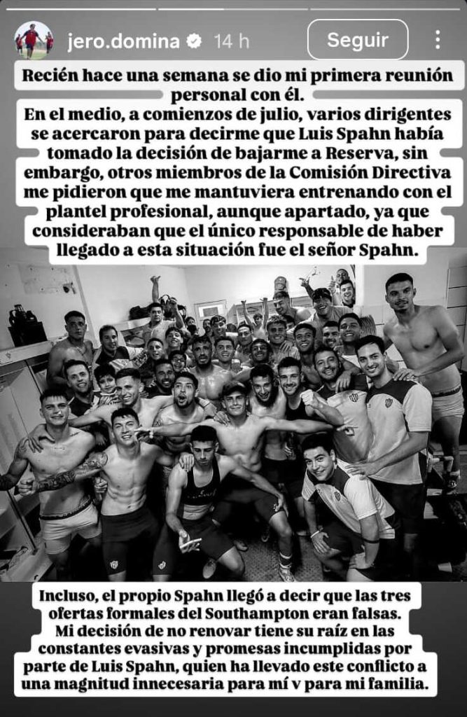 Dómina reveló además que fue bajado a Reserva por decisión directa de Spahn, a pesar de que otros miembros de la comisión directiva le pidieron que se mantuviera entrenando con el plantel profesional, aunque apartado. También negó que las ofertas del Southampton fueran falsas, como habría asegurado el presidente: “Mi decisión de no renovar tiene su raíz en las constantes evasivas y promesas incumplidas por parte de Luis Spahn”.