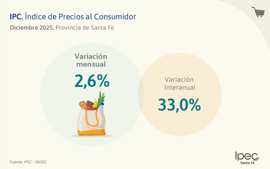 En Santa Fe, el promedio del último mes del año fue 0,2% menor que el porcentaje nacional; según datos del Instituto Provincial de Estadísticas y Censo (IPEC) la inflación de diciembre en la Provincia trepó al 2,6%. Por lo que acumuló en 2025 un 233%.