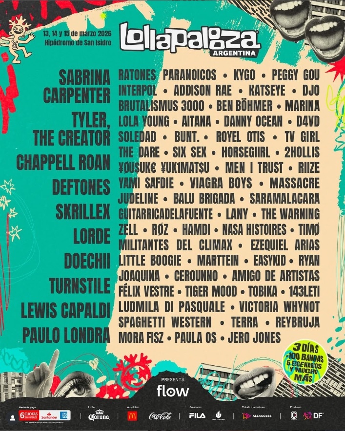 Tras una larga espera, la producción del Lollapalooza Argentina 2026 reveló quiénes son los artistas que forman parte de la nueva edición del festival: Sabrina Carpenter, Tyler, The Creator, Chappell Roan, Deftones, Skrillex, Lorde, Doechii, Turnstile, Lewis Capaldi y Paulo Londra encabezan la grilla del festival porgamado para el 13, 14 y 15 de marzo en el Hipódromo de San Isidro.
