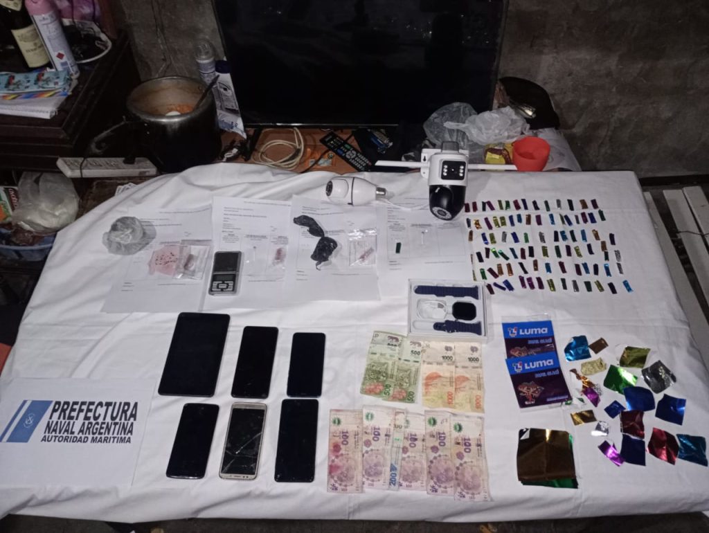 Los oficiales de Prefectura Naval Argentina, secuestraron 173 gramos de cocaína, 61 gramos de marihuana, 903 mil pesos en efectivo, 15 teléfonos celulares, 1 escopeta recortada -puede considerarse arma de guerra- calibre 12 y 19 municiones de distintos calibres, tres balanzas de precisión, una table, dos cámaras de videovigilancia tipo domo, un reloj Smartwacht, dos micro SD, siendo el aforo de todos los elementos secuestrados de más de 9 millones con 900 mil pesos.