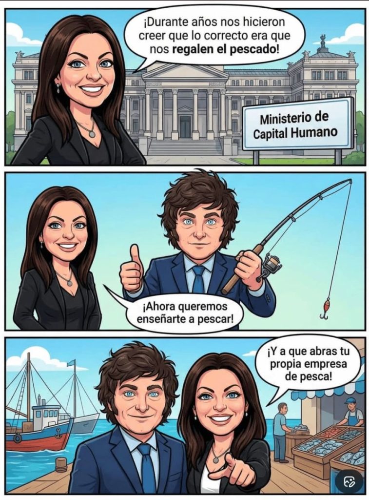 Uno de los cómics difundidos recientemente por el entorno de Pettovello la muestra junto a Milei dialogando sobre el rol del Estado. “Durante años nos hicieron creer que lo correcto era que nos regalen pescado”, reza el primer cuadro de la historieta publicada en la red social X.