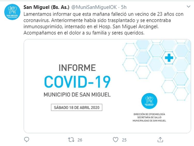 La información la dio a conocer la secretaría de Salud del Municipio. “Lamentamos informar que esta mañana falleció un vecino de 23 años con coronavirus. Anteriormente había sido trasplantado y se encontraba inmunosuprimido, internado en el Hospital San Miguel Arcángel. Acompañamos en el dolor a su familia y seres queridos”, expresaron a través de un comunicado.