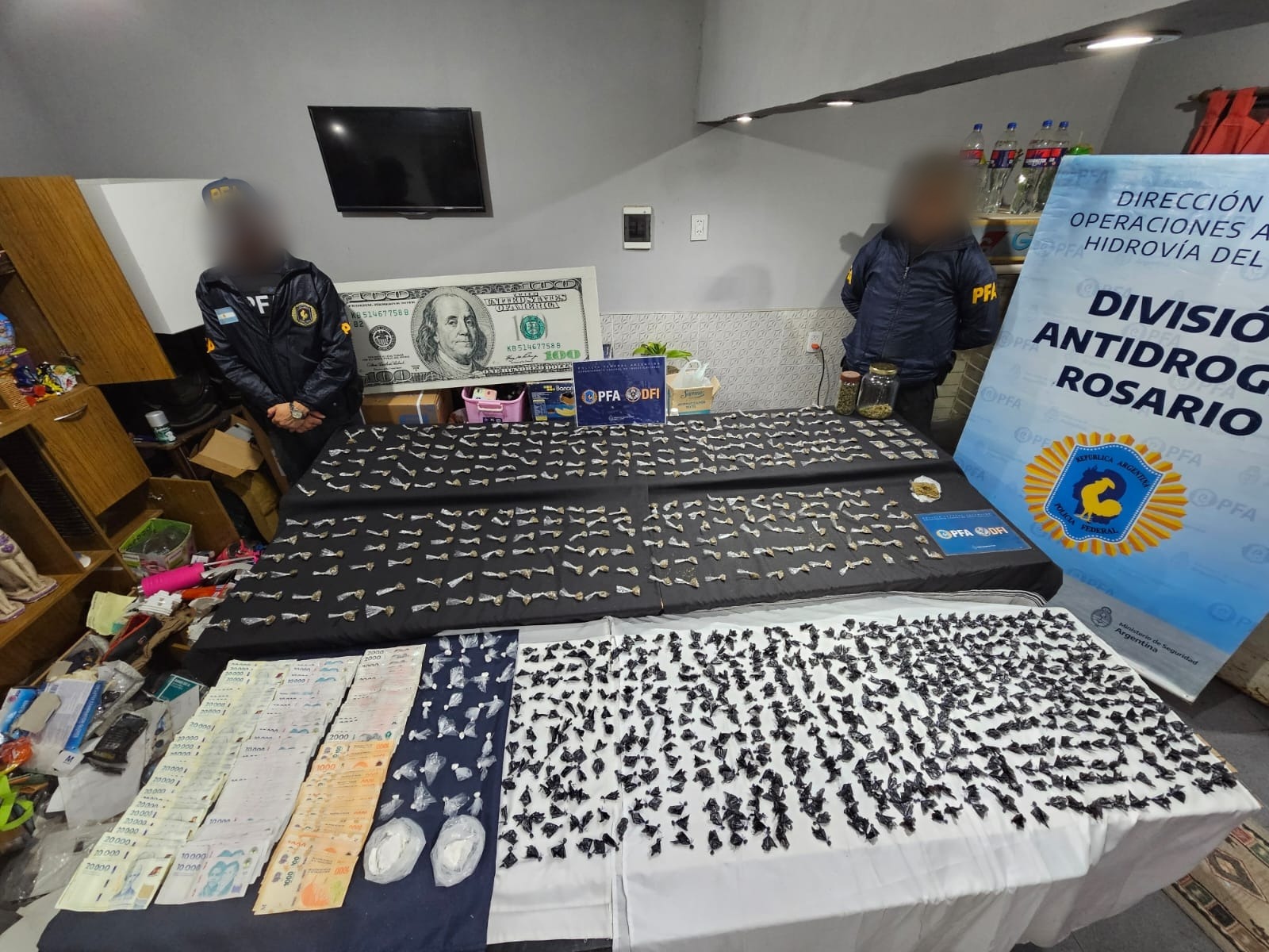 Durante el operativo, los agentes federales secuestraron unas 900 dosis de cocaína, 905 dosis de marihuana, cuatro balanzas de precisión, elementos utilizados para el corte y fraccionamiento de sustancias, un automóvil, aproximadamente dos millones de pesos en efectivo, nueve teléfonos celulares y otros elementos de interés para la causa.
