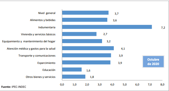 El Nivel general del Índice de Precios al Consumidor de Santa Fe (IPC_SF) registró en octubre de 2020 un aumento de 3,7% con relación al mes anterior.
