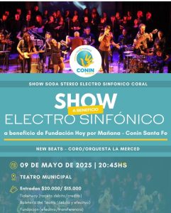 El próximo 9 de mayo a las 20.45 en el Teatro Municipal “1° de Mayo” tendrá lugar el show Soda Stéreo Electro Sinfónico Coral a beneficio de la Fundación Hoy por Mañana Conin Santa Fe.