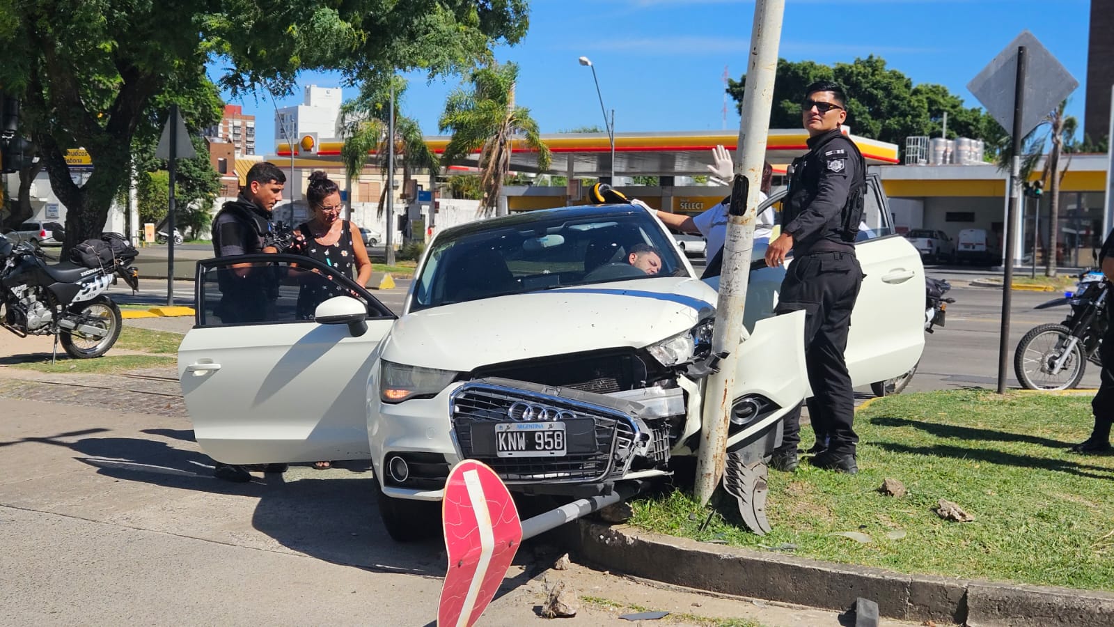 Por causas que aún se investigan, un Audi A1 de color blanco impactó de manera violenta contra una de las columnas ubicadas sobre la traza de la avenida. Como consecuencia del choque, el vehículo sufrió importantes daños en su parte frontal y fue necesario retirar cartelería de tránsito que se encontraba instalada en el lugar, debido que fue afectada por el impacto.