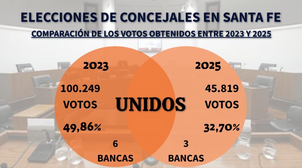 En 2023, Unidos había conseguido un triunfo contundente en la categoría concejales, con 100.249 votos y un 49,86 % del total, lo que le permitió incorporar seis ediles al cuerpo legislativo. Sin embargo, en 2025 solo logró 45.819 votos, que representan un 32,7 % del padrón y apenas un 15% sobre el total del padrón electoral en la ciudad.